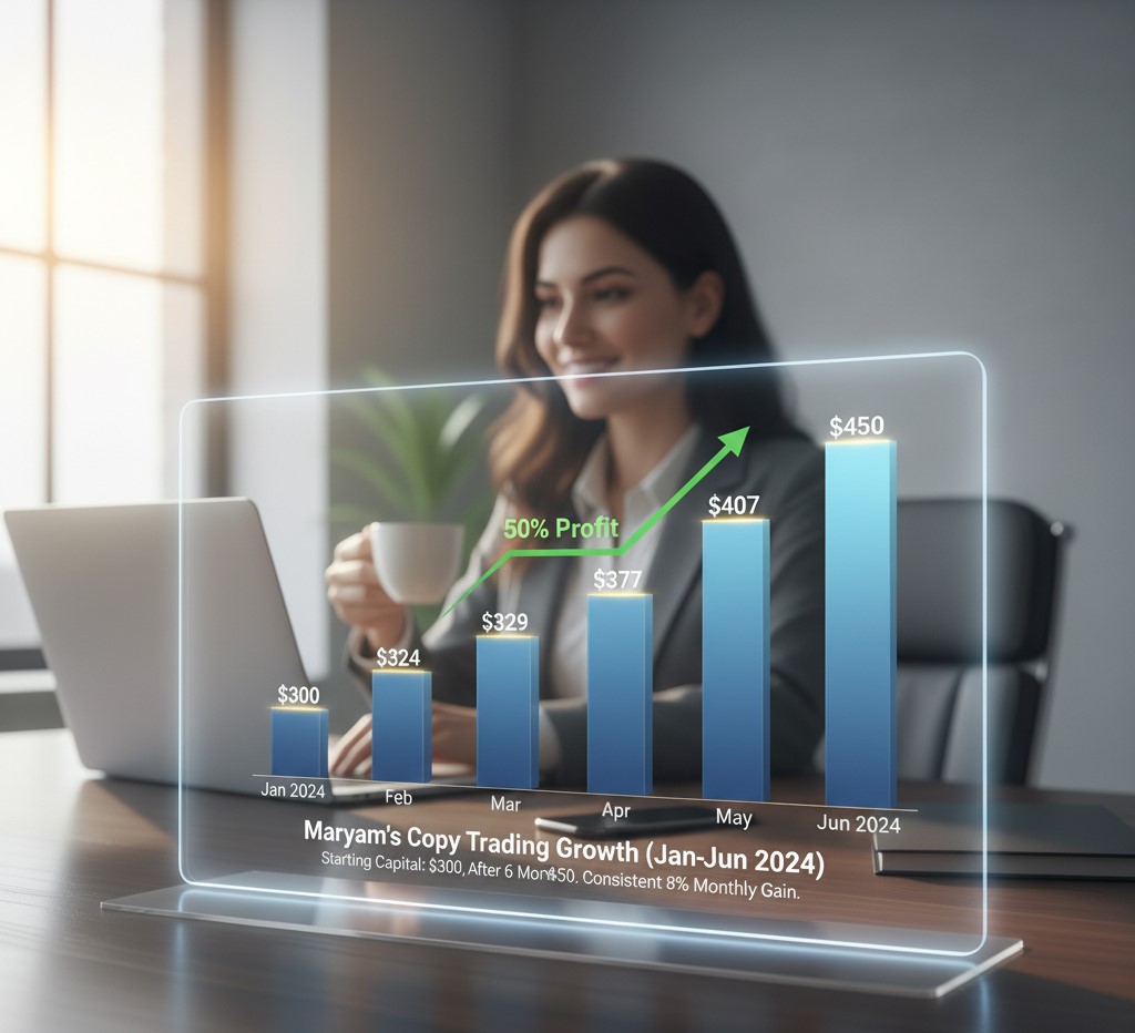 مریم، یک حسابدار ۳۰ ساله، در ابتدای ۲۰۲۴ تصمیم گرفت وارد کپی ترید شود. او ۳۰۰ دلار سرمایه داشت. بهجای انتخاب تریدری که در یک ماه ۶۰٪ سود داده بود، سراغ کسی رفت که در ۱۸ ماه اخیر میانگین ماهانه ۸٪ سود با افت سرمایه کمتر از ۱۲٪ داشت.