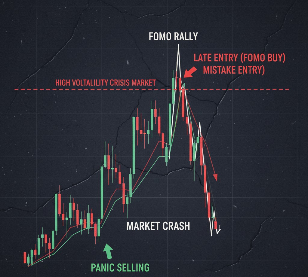 وقتی بازار سریع حرکت میکند، تریدرهای هیجانی دچار FOMO میشوند و دیر وارد میشوند.